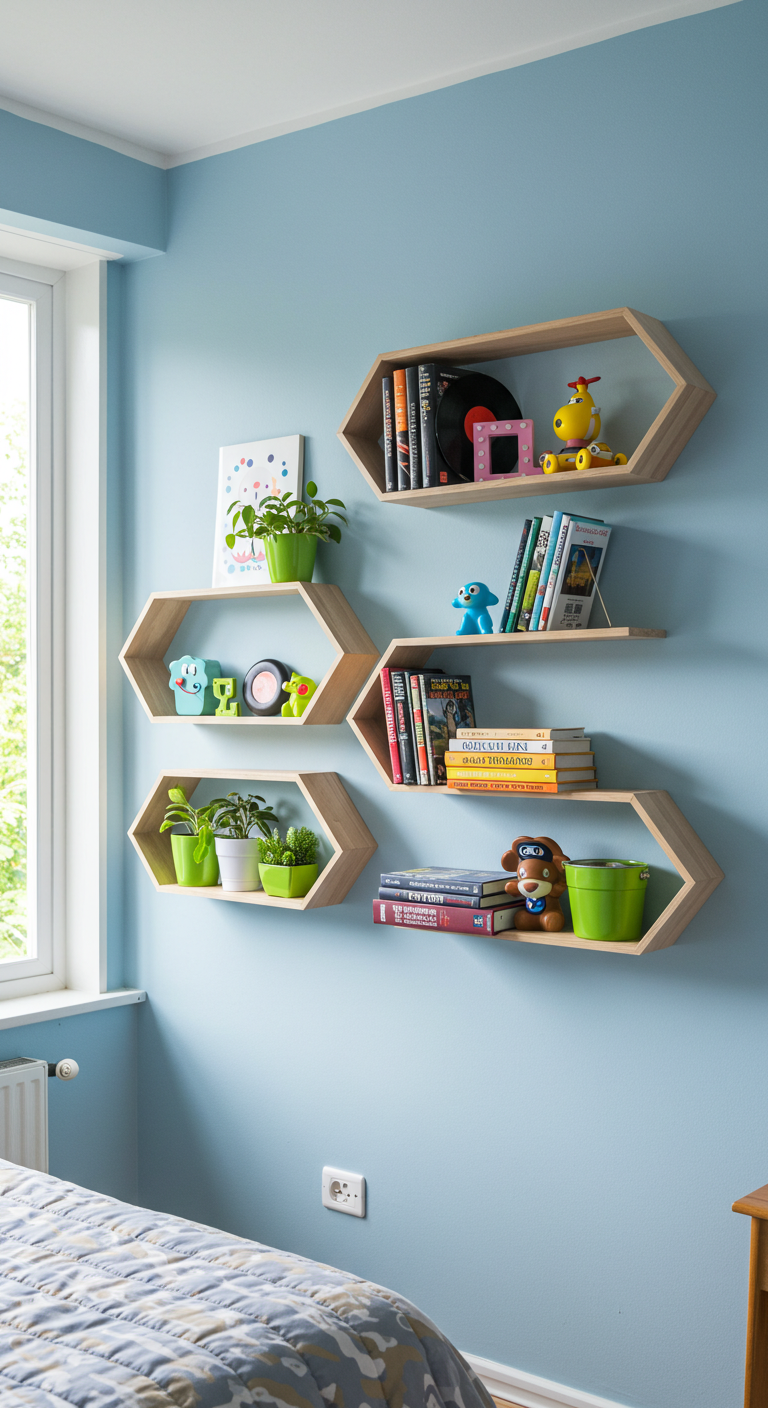 Installez des étagères aux formes géométriques originales pour exposer livres, objets déco et souvenirs. Ces étagères deviennent de véritables œuvres d’art murales tout en offrant du rangement pratique. Jouez avec les formes hexagonales, triangulaires ou en nid d’abeille pour créer une composition unique et moderne qui reflète la personnalité créative de votre ado.