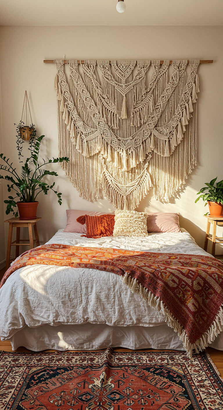 Créez une tête de lit originale avec un tissage en macramé fait main. Cette tendance bohème apporte texture et chaleur à l’espace tout en servant de point focal artistique. Le macramé se décline en nombreux motifs, des plus simples aux plus élaborés, permettant de personnaliser complètement le look selon les goûts de votre ado.