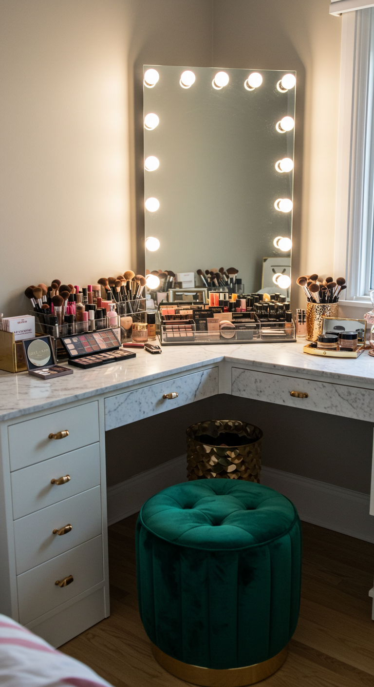 Aménagez un coin beauté digne d’un influenceur avec un miroir à ampoules style Hollywood, des rangements transparents et un siège confortable. L’éclairage parfait est essentiel pour ce coin : privilégiez des ampoules blanches autour du miroir. Ajoutez des détails dorés ou rosés pour une touche glamour qui fera sensation sur les réseaux sociaux.