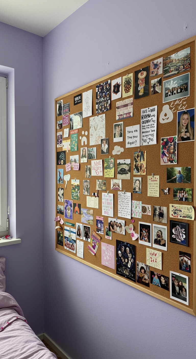 Créez un mur d’inspiration avec de grands panneaux en liège où votre ado peut épingler photos, billets de concert, citations motivantes et souvenirs. Cette décoration évolutive permet d’afficher facilement de nouveaux éléments. Encadrez les panneaux de liège pour un look plus soigné et coordonnez les épingles aux couleurs de la chambre.