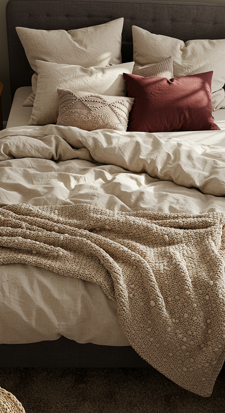 Maîtrisez l’art du layering textile avec des draps en lin, des couettes moelleuses et une collection de coussins aux textures variées. Mélangez tricot chunky, velours, fausse fourrure et coton pour créer un lit irrésistiblement cosy. Jouez avec les tons neutres rehaussés par une ou deux couleurs accent pour un effet sophistiqué et chaleureux.