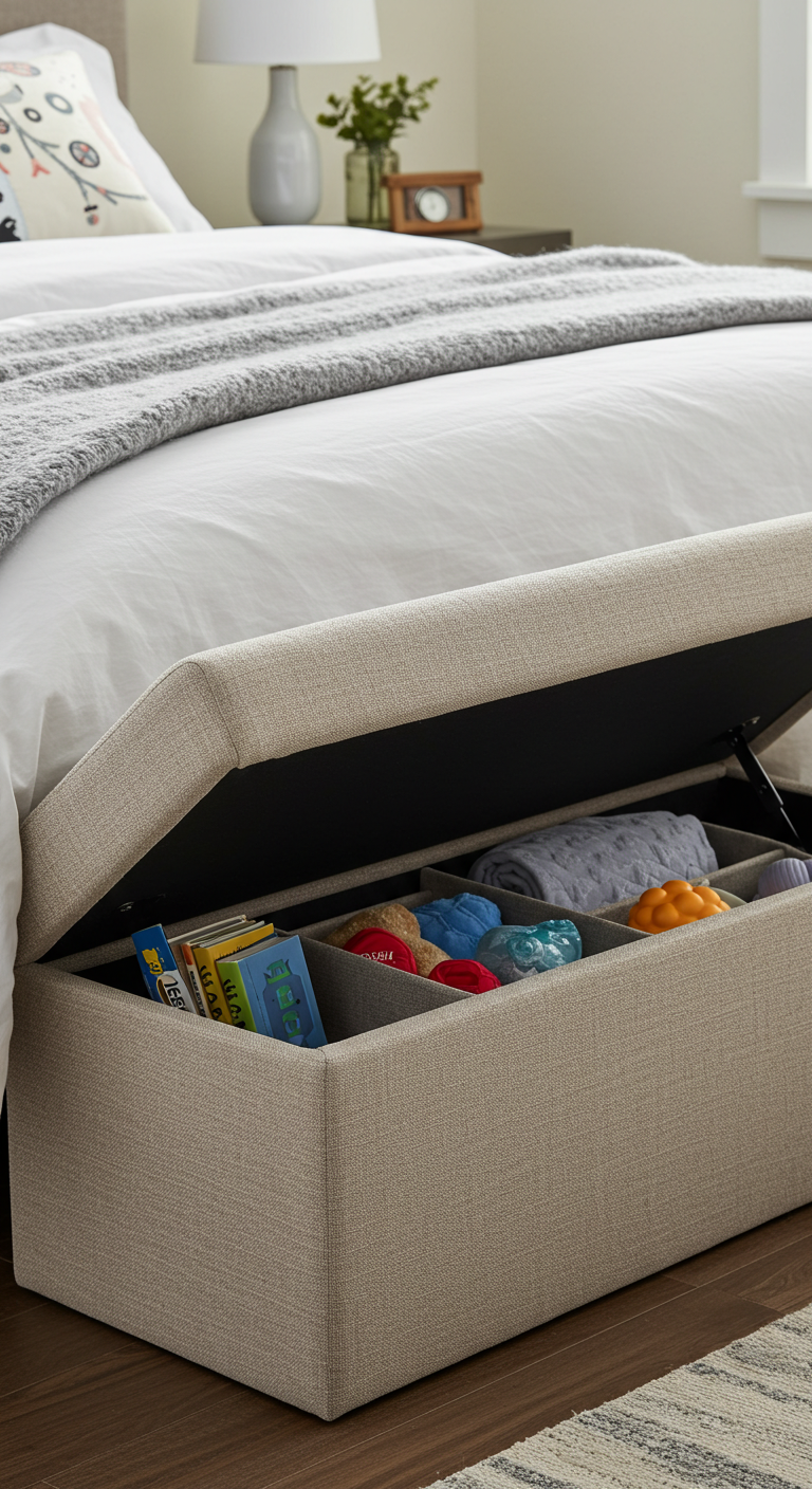 Intégrez un pouf coffre au pied du lit pour allier style et praticité. Cet élément multifonction sert d’assise, de table d’appoint et de rangement caché. Choisissez un modèle dans un tissu qui s’harmonise avec la déco ou osez un imprimé qui apporte du caractère. C’est la solution parfaite pour ranger couvertures supplémentaires, vêtements de saison ou objets divers.