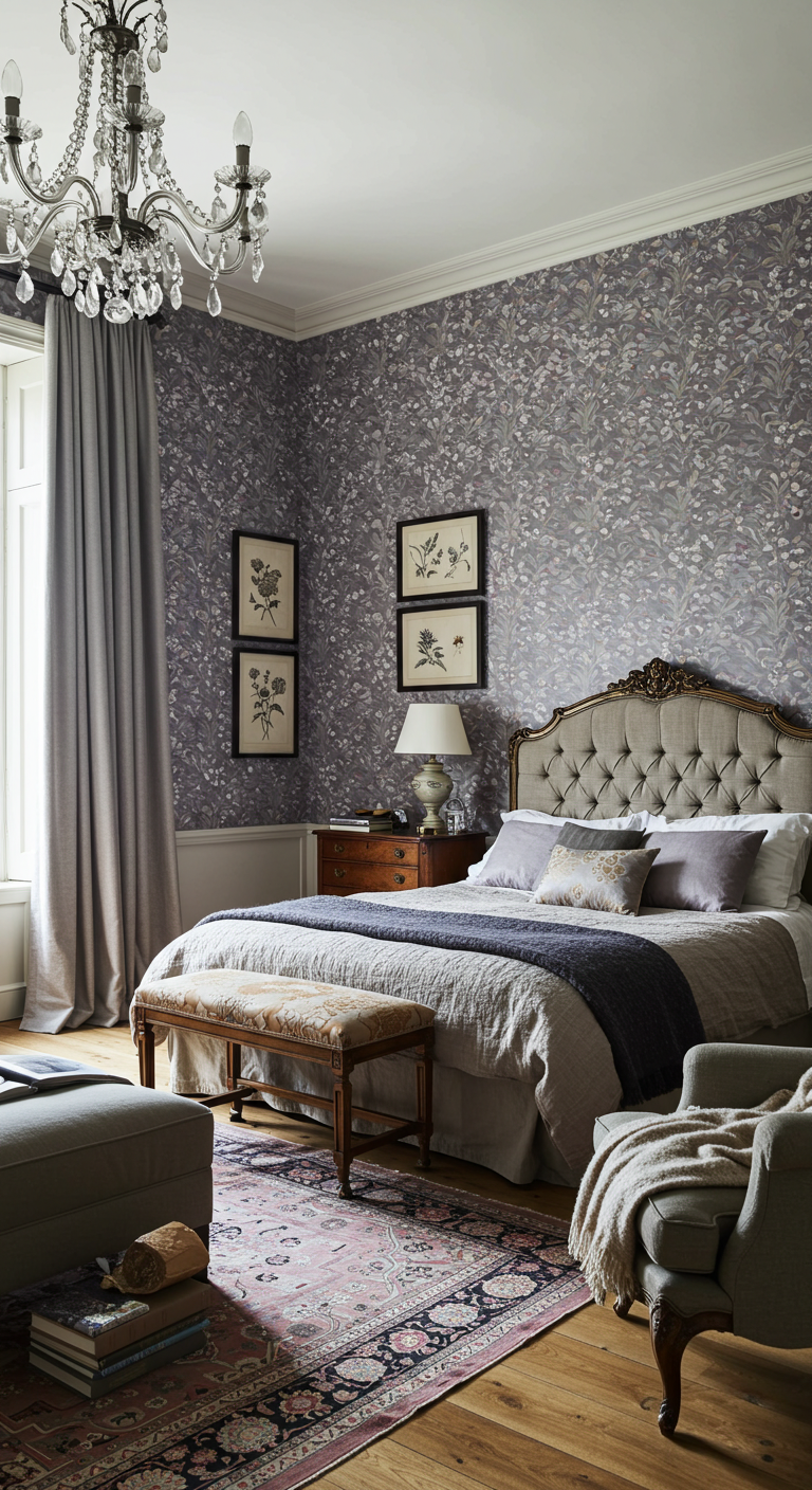 Privilégiez des motifs floraux stylisés dans des palettes de couleurs harmonieuses. Les tons sourds comme le rose poudré, le vert sauge, ou le bleu grisé créent une ambiance apaisante tout en ajoutant de la profondeur visuelle. Pour un effet maximum, appliquez le papier peint sur un seul mur – généralement celui derrière la tête de lit – créant ainsi un magnifique mur d’accent.