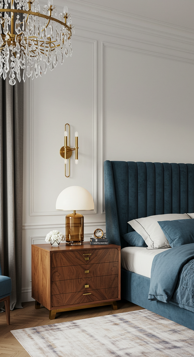 Pour éviter un effet trop lourd, alternez les pièces en bois massif avec des éléments plus légers : une commode en noyer peut être équilibrée par des tables de chevet aux pieds fins dorés, ou un miroir au cadre métallique doré.