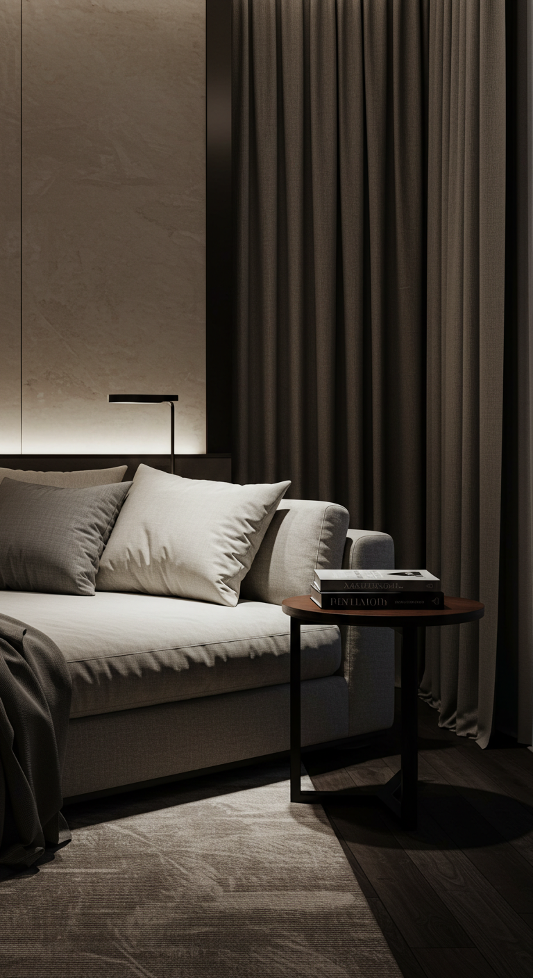Une méridienne élégante placée près d’une fenêtre crée l’endroit parfait pour la lecture matinale ou la méditation. Si l’espace le permet, un petit canapé deux places avec une table basse forme un salon intime idéal pour les conversations privées ou les moments de détente partagés.