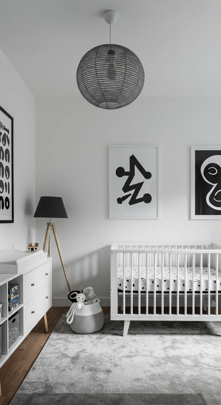 L’élégance du noir et blanc pour une chambre bébé sophistiquée. Cette approche monochrome stimule le développement visuel de bébé.