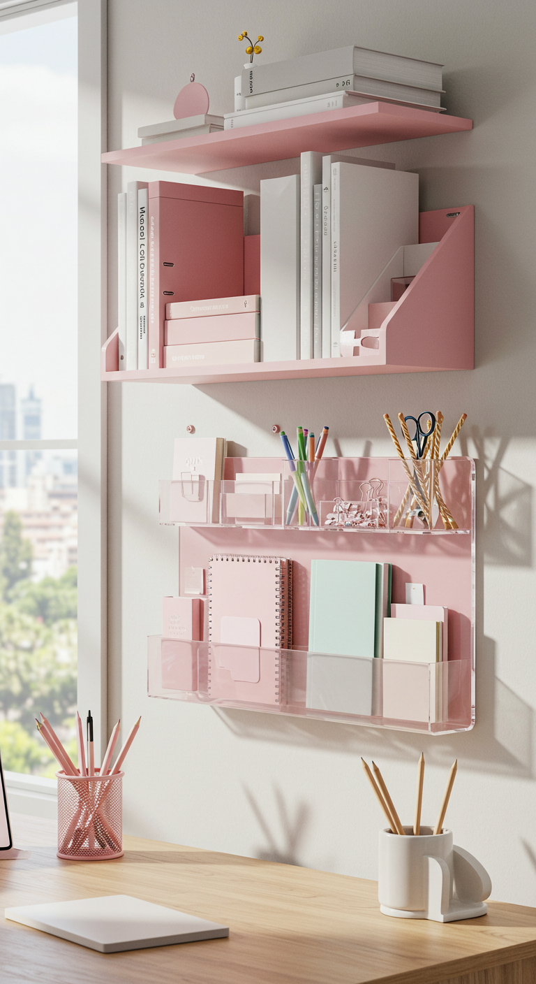 Les rangements muraux sont essentiels dans un petit bureau ou pour celles qui aiment un plan de travail minimaliste. L’acrylique transparent crée une impression de légèreté et permet de voir facilement ce que vous avez stocké, tandis que les accents roses (porte-stylos, séparateurs, étiquettes) ajoutent cette touche féminine cohérente avec votre thème.