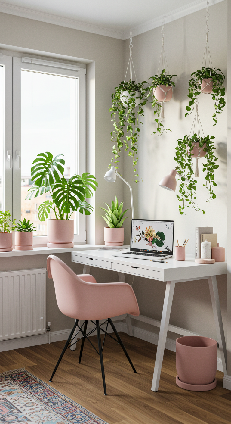 Mélangez différentes textures de pots : céramique mate, terre cuite peinte en rose, pots en béton teinté rose pâle. Variez également les hauteurs avec des plantes posées sur le bureau, sur des étagères, et même des plantes suspendues. Les monsteras, pothos, et succulentes sont particulièrement photogéniques et faciles d’entretien.