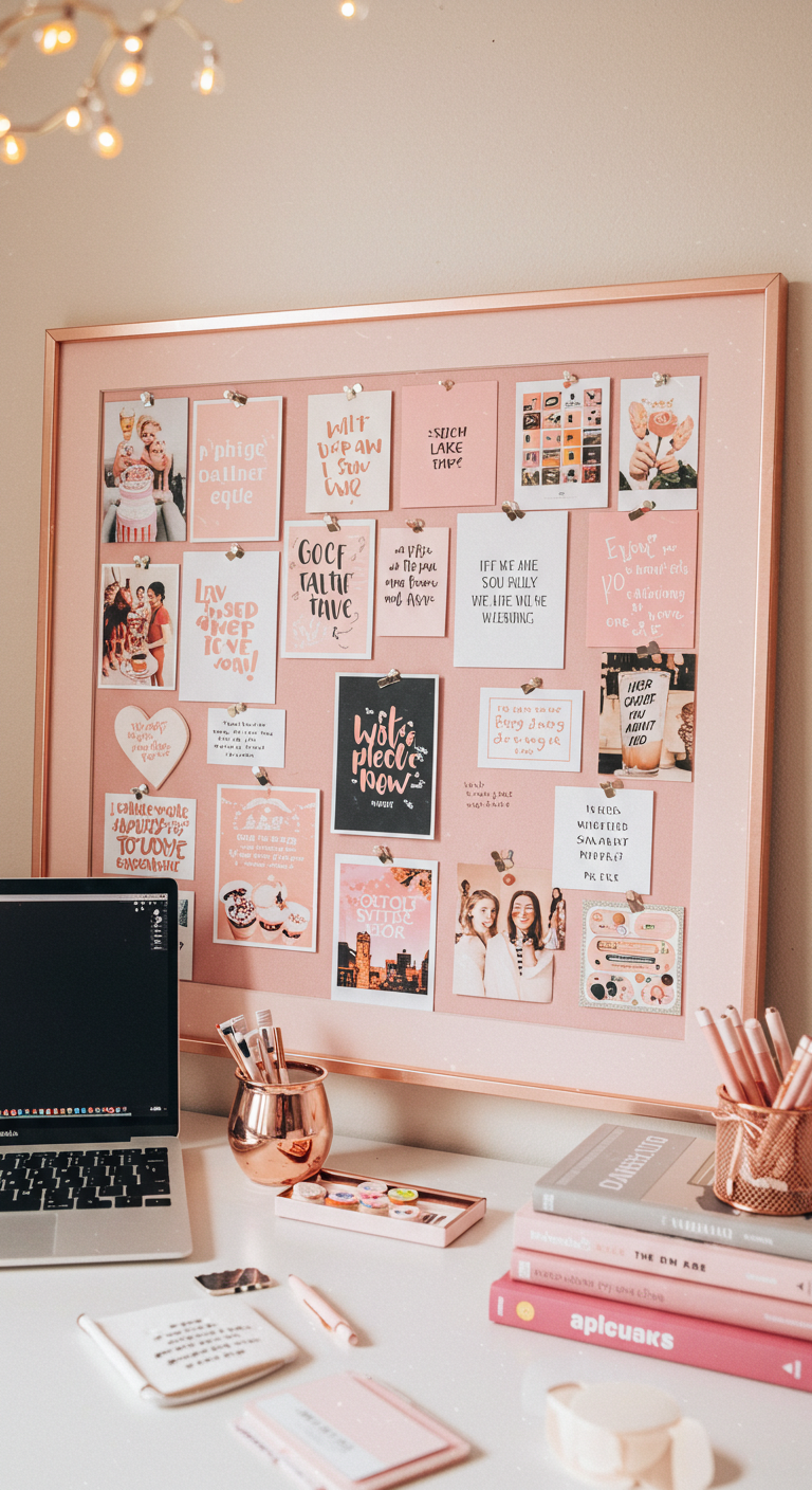 Créez un mood board sophistiqué dans un grand cadre rose gold pour afficher vos inspirations, objectifs et citations motivantes. C’est à la fois décoratif et fonctionnel.