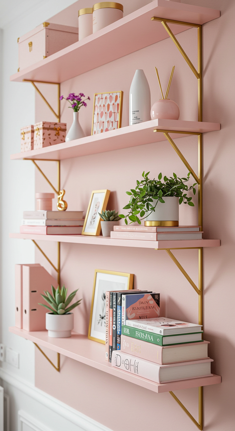 10. Les Étagères Flottantes Rose Blush avec Support Doré