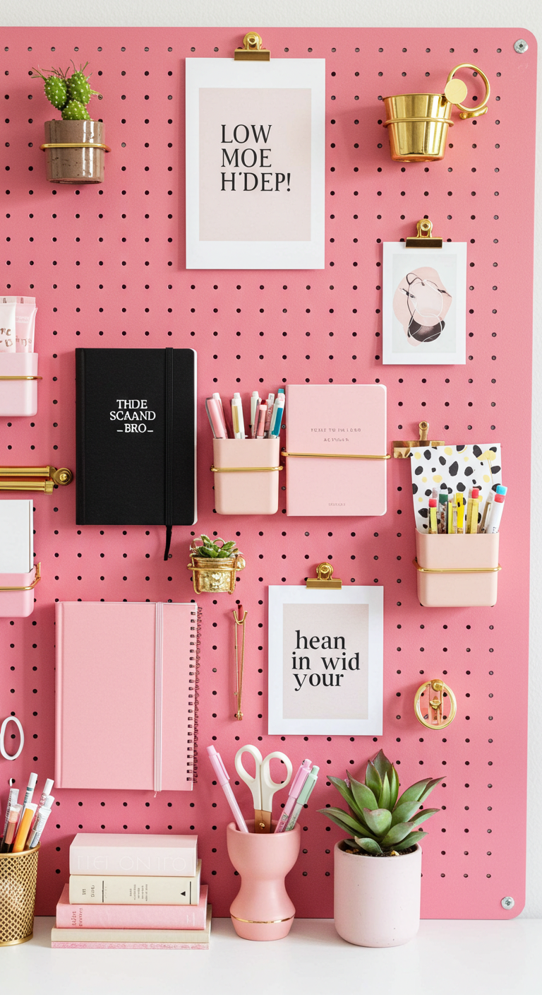 Adoptez la tendance du pegboard (panneau perforé) dans une version rose moderne avec des accessoires dorés pour un rangement vertical ultra fonctionnel et esthétique.