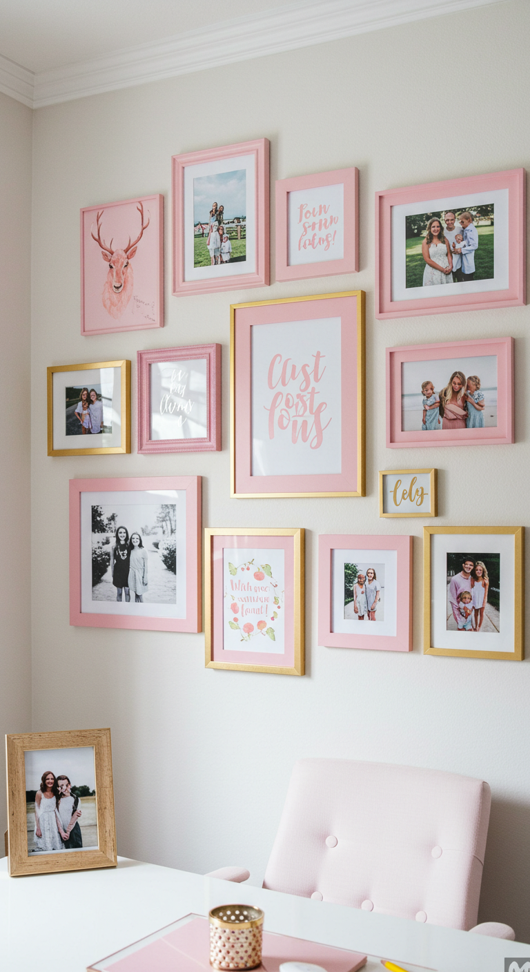 Créez un mur de galerie cohérent avec une collection de cadres dans différentes nuances de rose, d’or et de rose gold, mélangeant photos personnelles et prints motivants.