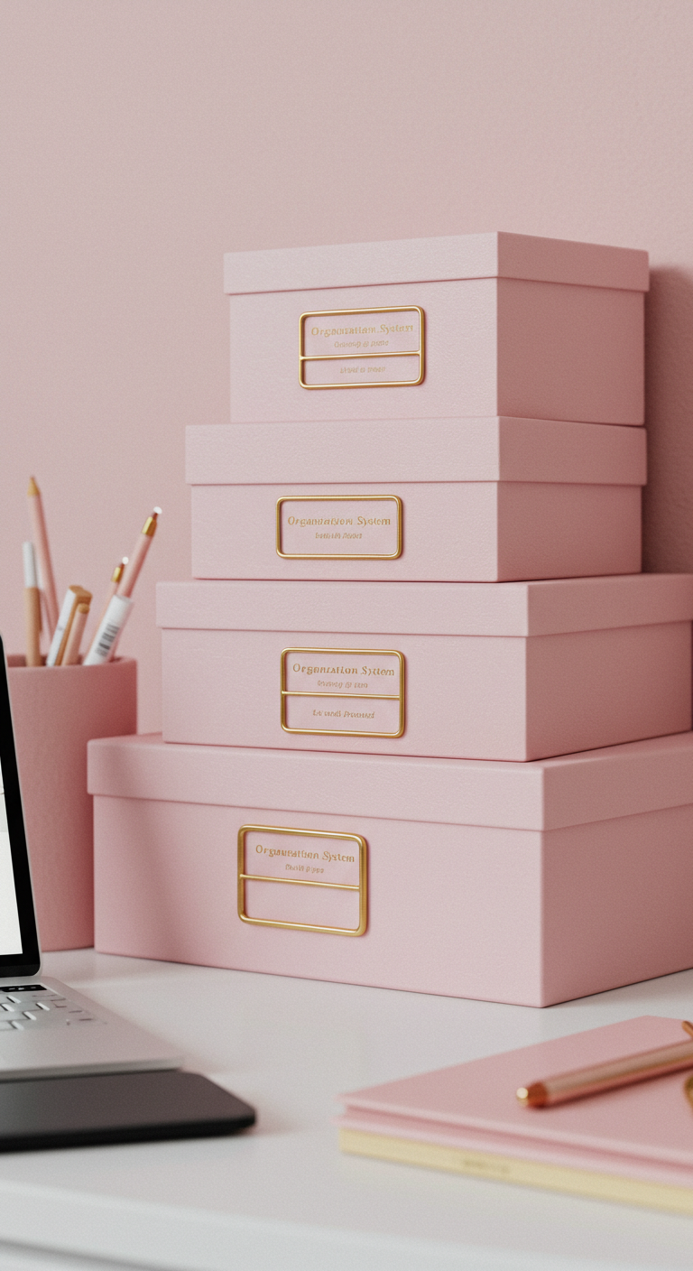 Les boîtes de rangement coordonnées sont la clé d’un bureau à l’apparence toujours impeccable. Optez pour des boîtes en carton rigide recouvert de tissu rose, en plastique rose mat de haute qualité, ou même en acrylique rose transparent. Les coins et poignées dorés ajoutent une touche de sophistication. Étiquetez chaque boîte clairement pour savoir exactement où tout se trouve.