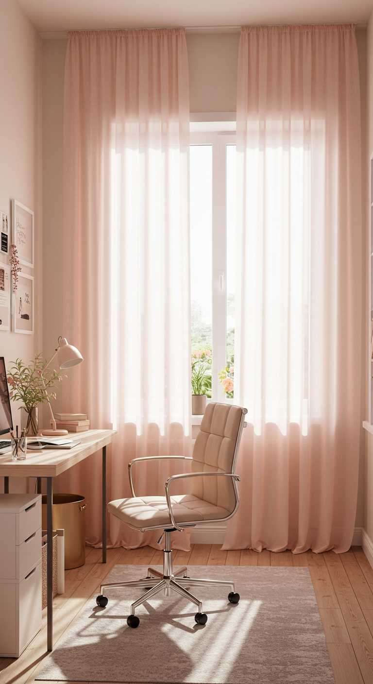 Le traitement des fenêtres est souvent négligé mais fait une énorme différence dans l’ambiance générale. Des rideaux en voilage rose tendre créent une lumière diffuse et romantique, parfaite pour réduire l’éblouissement sur votre écran tout en maintenant une atmosphère lumineuse. Pour plus de contrôle, optez pour des stores cellulaires roses qui offrent isolation et obscurcissement modulable.