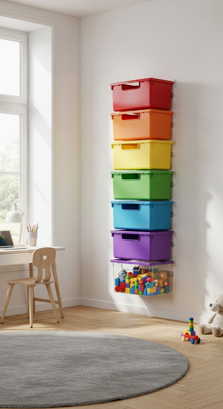 Transformez un mur entier en véritable œuvre d’art fonctionnelle avec des bacs suspendus aux couleurs de l’arc-en-ciel ! Cette solution de rangement verticale est idéale pour optimiser l’espace tout en créant un point focal joyeux dans la chambre.