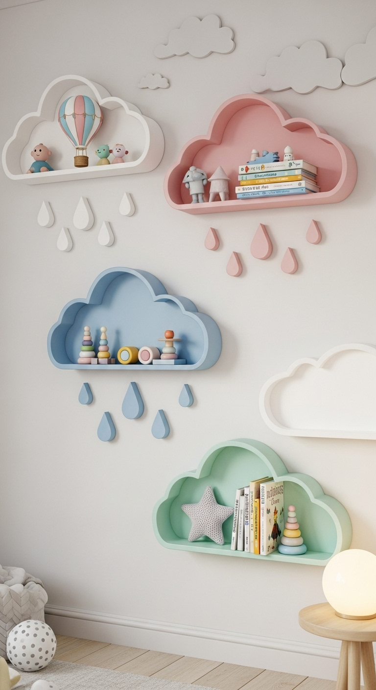Apportez un peu de magie céleste dans la chambre avec ces étagères en forme de nuages et de gouttes d’eau ! Ces petites étagères flottantes sont parfaites pour exposer les trésors préférés de vos enfants.