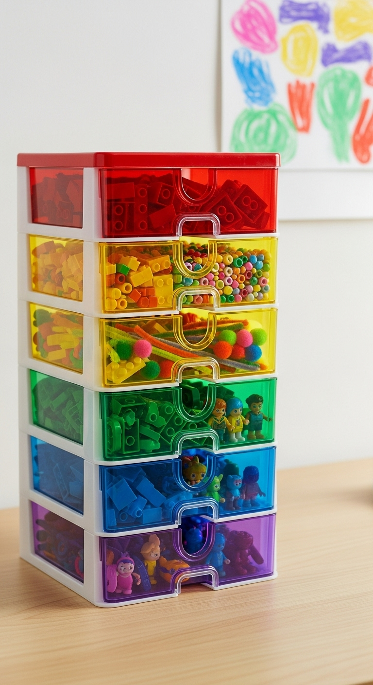 Organisation optimale : Utilisez ce système pour les petits jouets comme les LEGO, les figurines, les accessoires de poupées, les voitures miniatures. Ajoutez des étiquettes avec photos pour les plus jeunes.