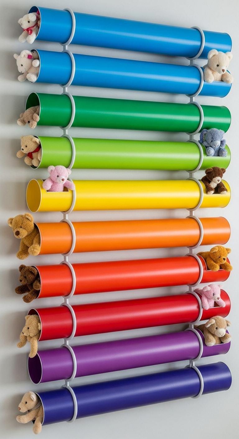 Voici l’idée la plus audacieuse et Instagram-friendly de toutes ! Ces tubes colorés fixés horizontalement au mur créent un véritable mur d’exposition ludique où chaque jouet devient une œuvre d’art visible.