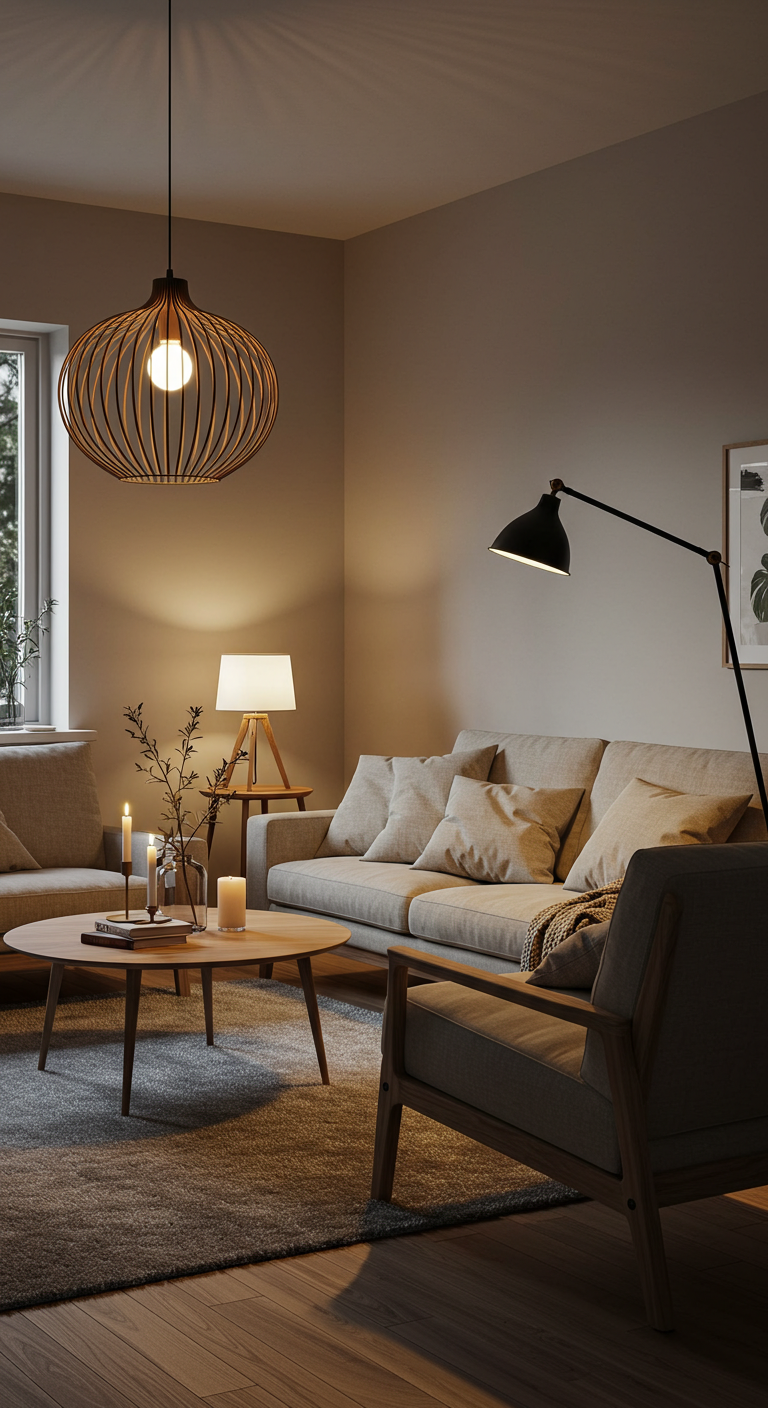L’éclairage multicouche est le secret d’un salon scandinave qui reste lumineux même après le coucher du soleil. Cette approche créé différentes ambiances selon les moments de la journée.