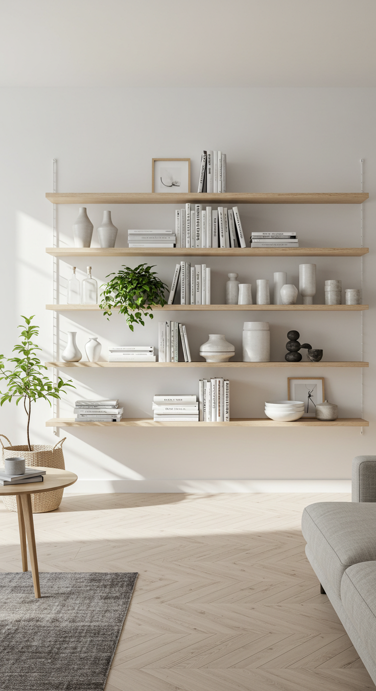 7. Les Étagères Flottantes en Bois Clair : Le Rangement Invisible