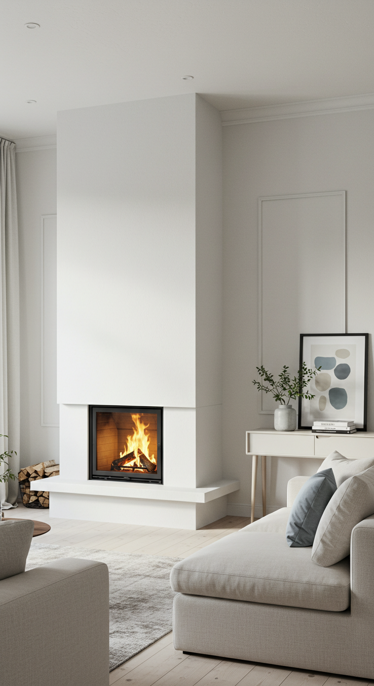 Une cheminée blanche minimaliste devient le point focal parfait d’un salon scandinave lumineux. Elle apporte chaleur et confort tout en conservant l’esthétique épurée.