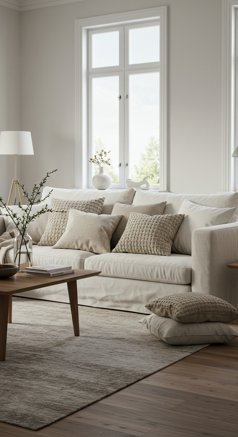 Les coussins texturés dans des tons neutres ajoutent des layers de confort et d’intérêt tactile sans compromettre la palette lumineuse du salon scandinave.