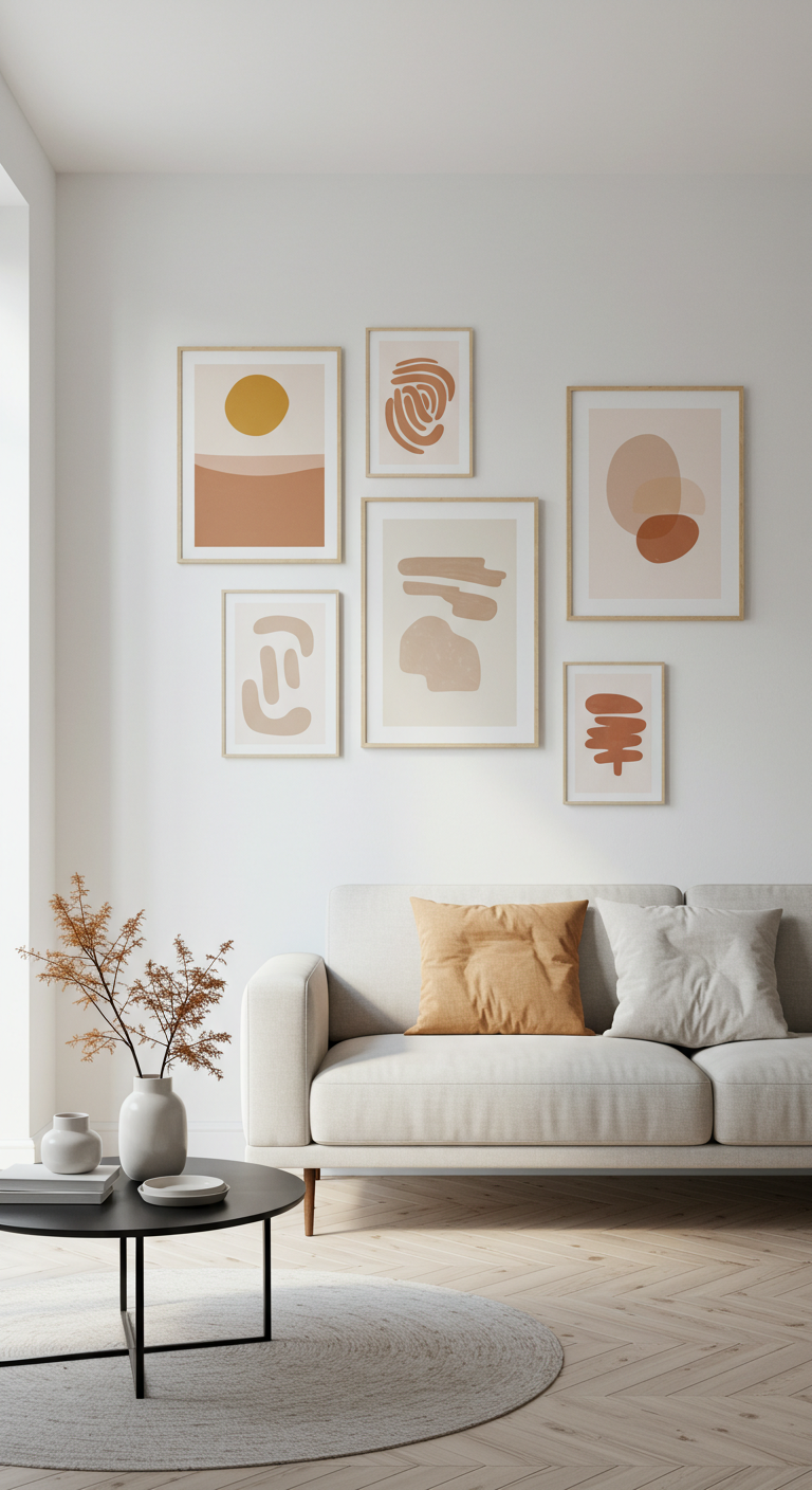 Règle d’accrochage : Centrez vos œuvres à hauteur des yeux (environ 1,50m du sol) et laissez respirer chaque pièce.