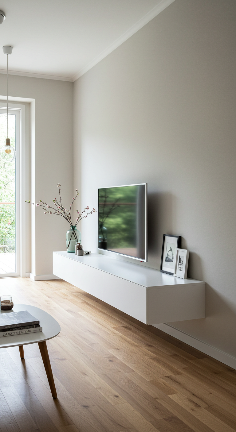 Une console TV suspendue maintient l’impression d’espace et de légèreté si importante dans un salon scandinave lumineux. Elle évite l’encombrement visuel au sol.