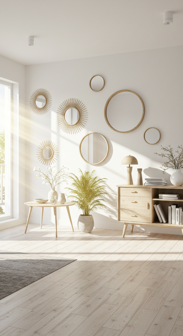 Les miroirs ronds sont des alliés précieux pour multiplier la lumière naturelle dans un salon scandinave. Leur forme douce s’intègre parfaitement à l’esthétique nordique.