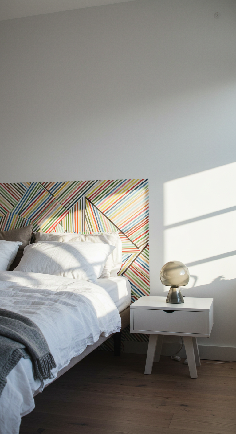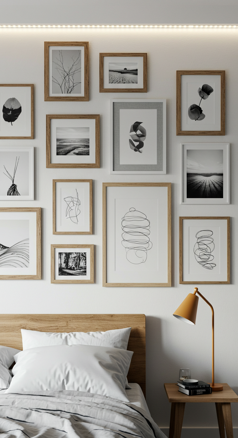 Image Prompt: “DIY gallery wall in bedroom with handmade frames, mixed artwork, photos, and prints arranged on white wall, cozy lighting, modern minimalist style”