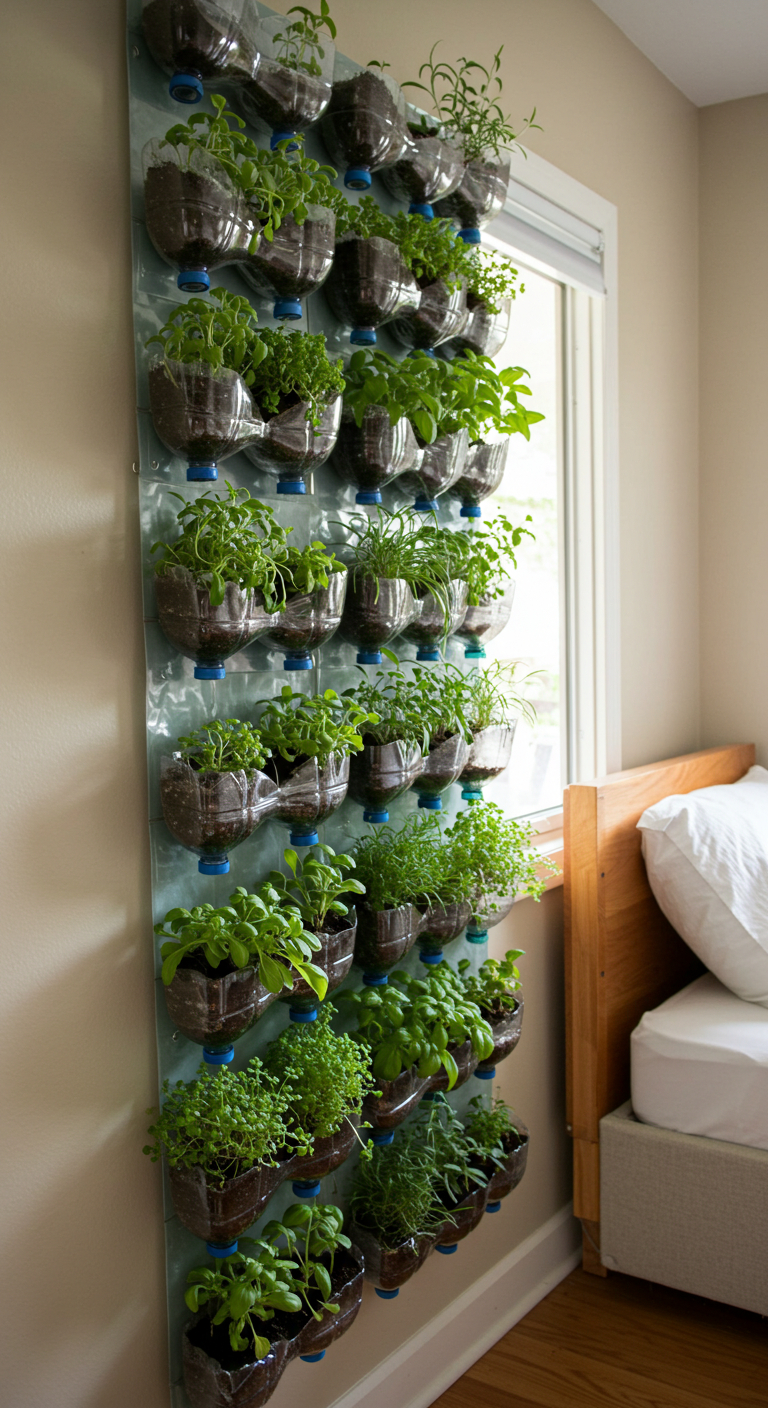 Image Prompt: “Vertical garden made from recycled plastic bottles hanging on bedroom wall, small plants and herbs growing, natural lighting, eco-friendly sustainable decor”