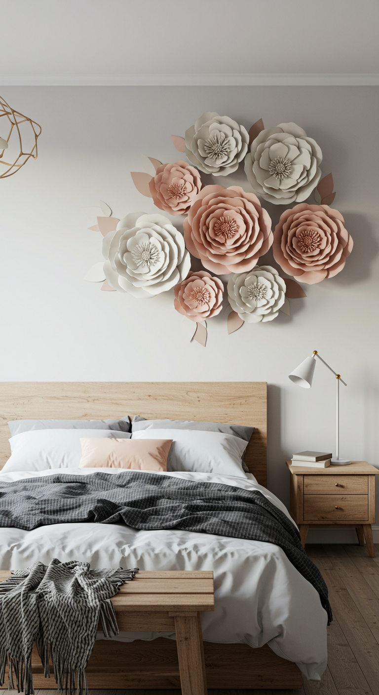 Image Prompt: “Large paper flowers on bedroom wall, various sizes and pastel colors, handmade tissue paper and crepe paper flowers, elegant minimal bedroom decor”