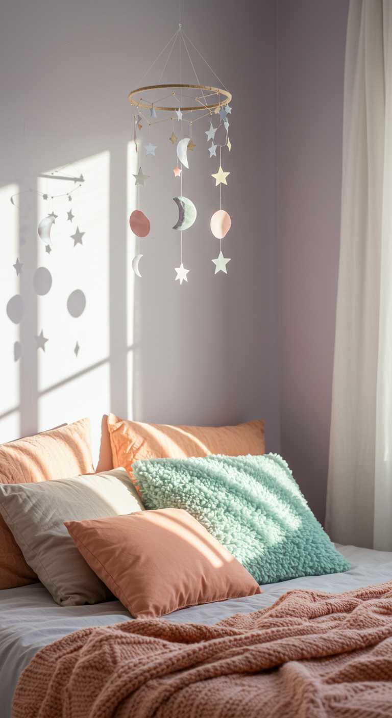Image Prompt: “Romantic bed canopy made from flowing white tulle fabric, hanging from ceiling hook, dreamy bedroom atmosphere, soft natural lighting”