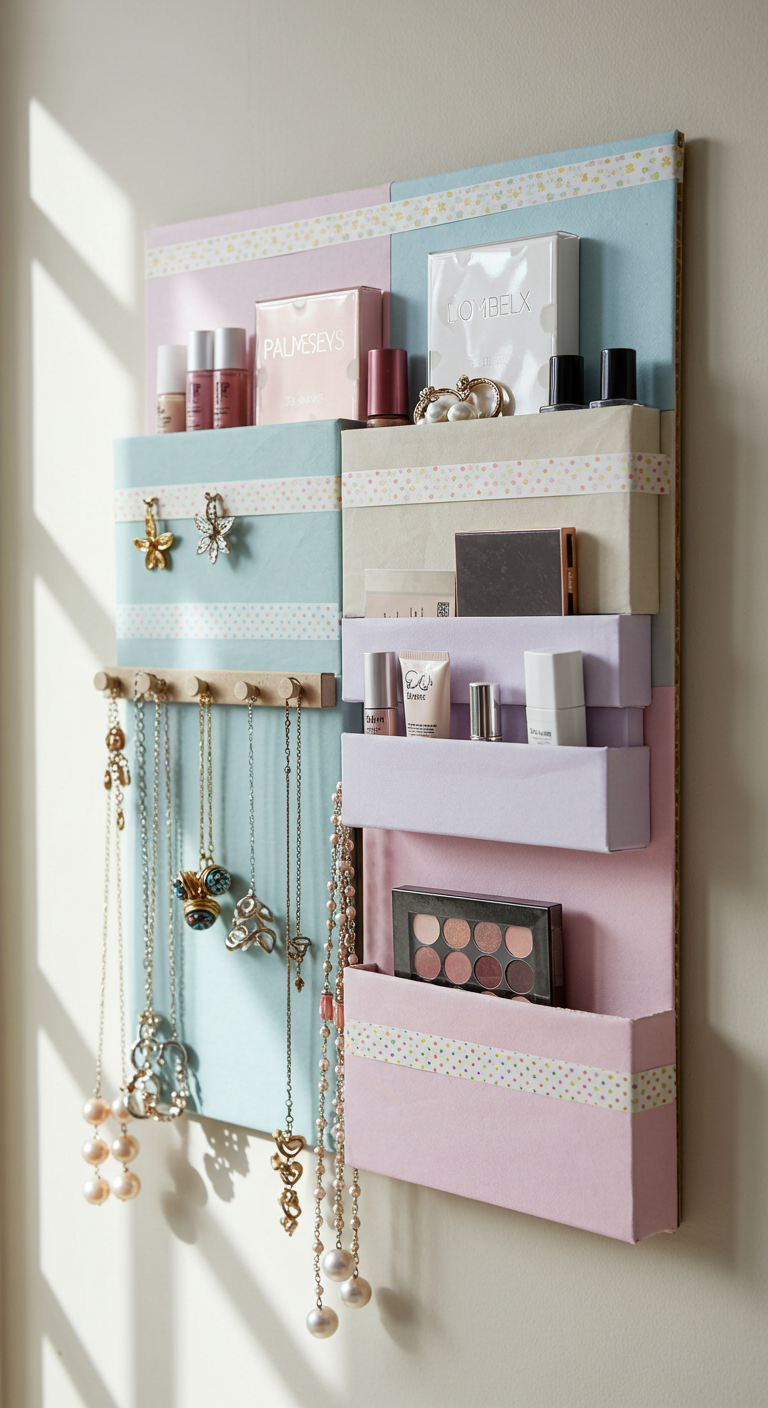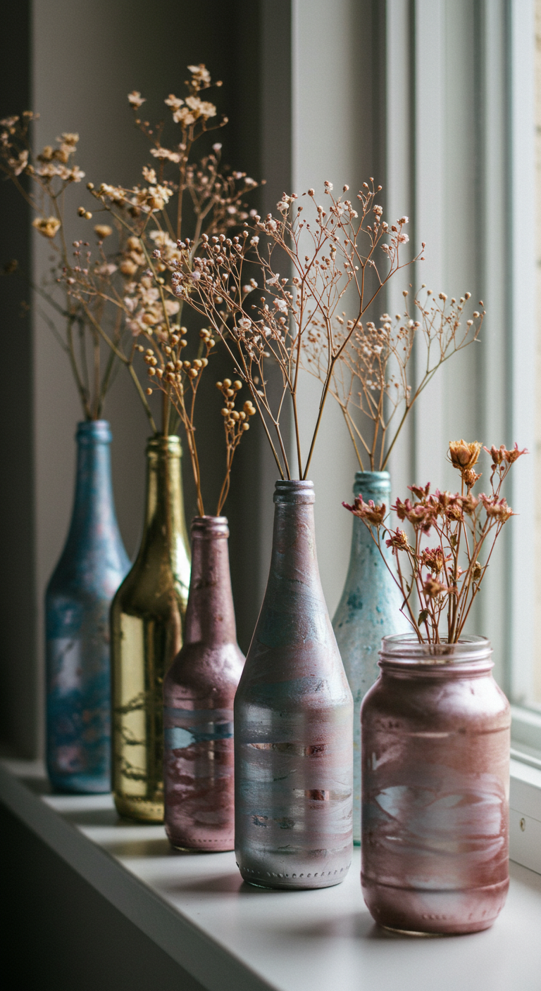 Image Prompt: “Upcycled glass bottles and jars transformed into decorative vases, painted in metallic and pastel colors, filled with dried flowers, bedroom windowsill display”
