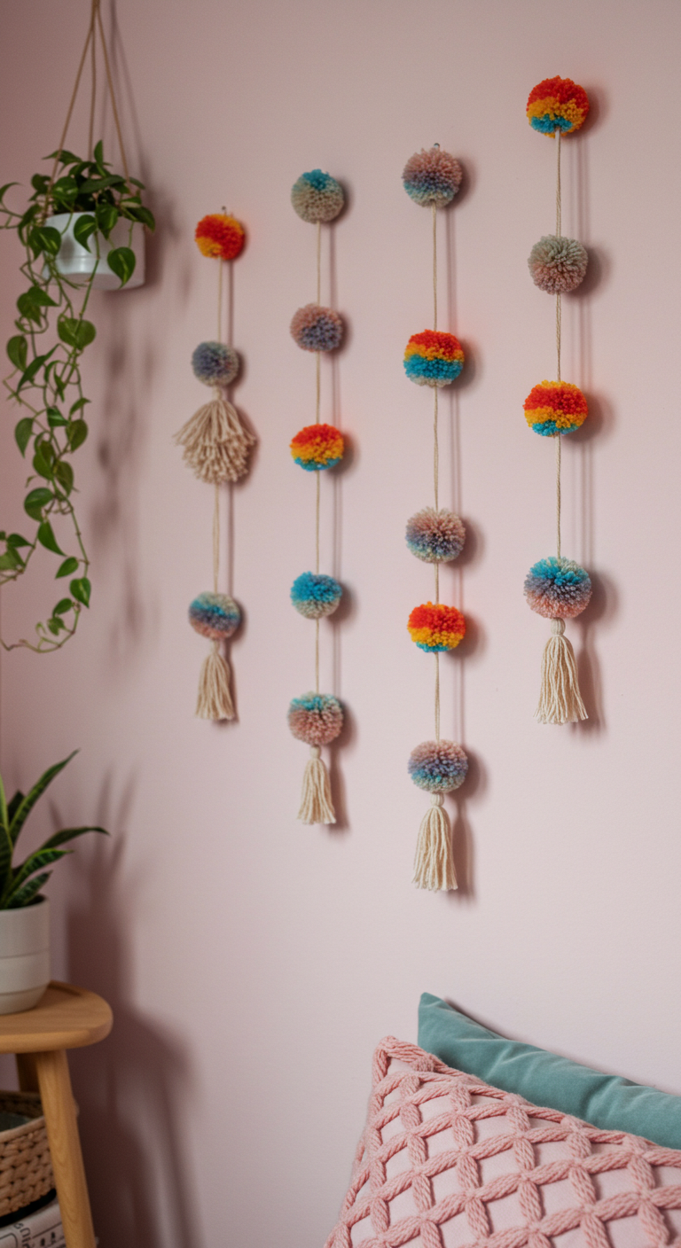 Image Prompt: “Handmade colorful yarn pompoms hanging on bedroom wall, various sizes and rainbow colors, playful decoration with tassels and fringe details”