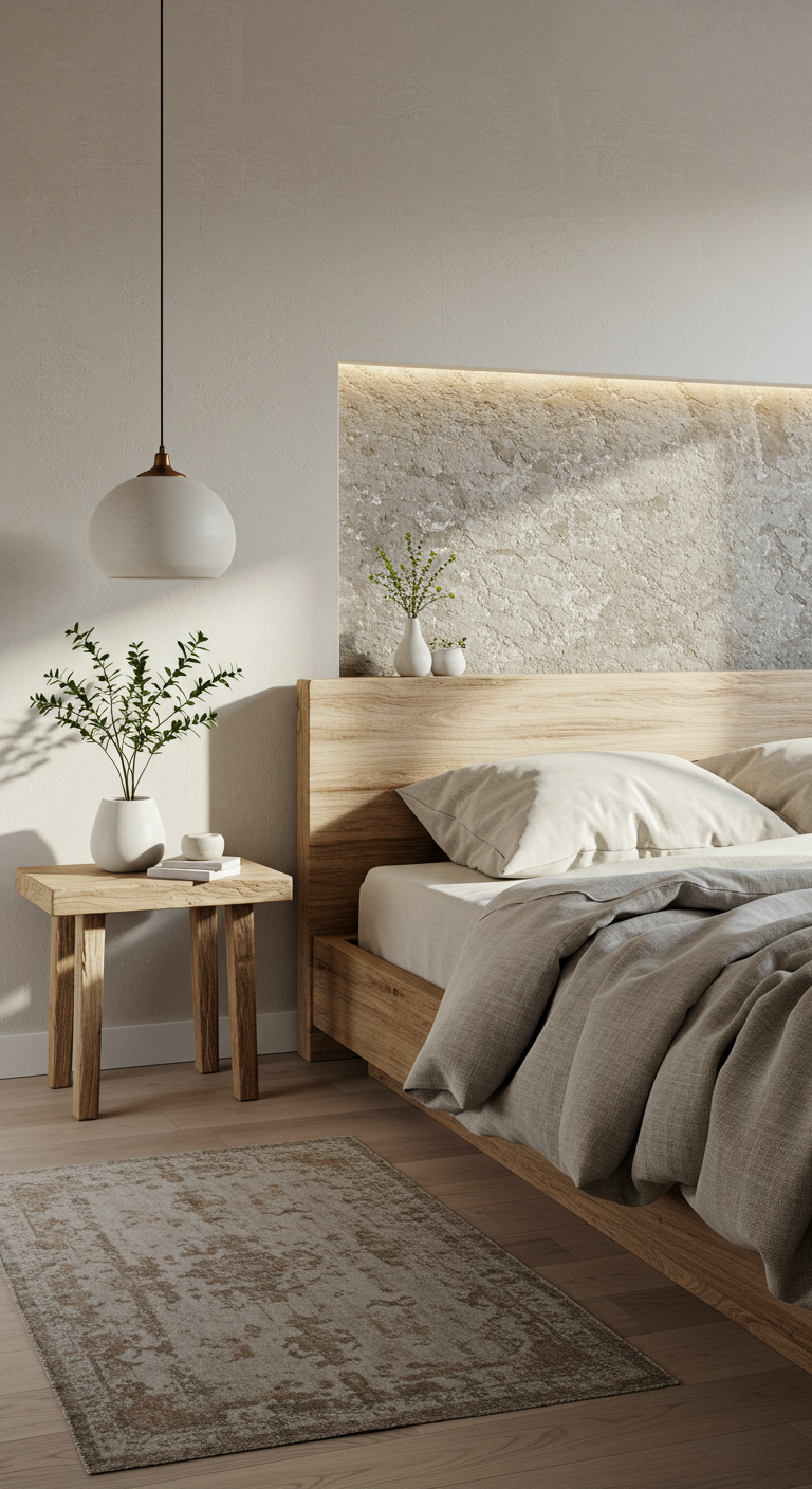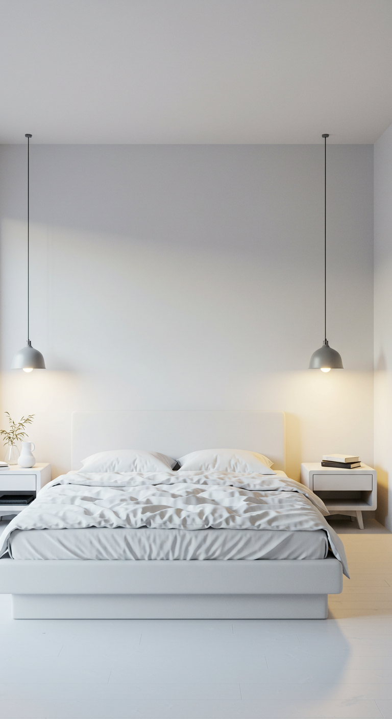 L’éclairage est l’âme de toute décoration minimaliste réussie. Abandonnez les lustres imposants au profit d’un éclairage indirect qui baigne la pièce d’une lumière douce et uniforme. Les lampes suspendues de chaque côté du lit remplacent élégamment les traditionnelles lampes de chevet.