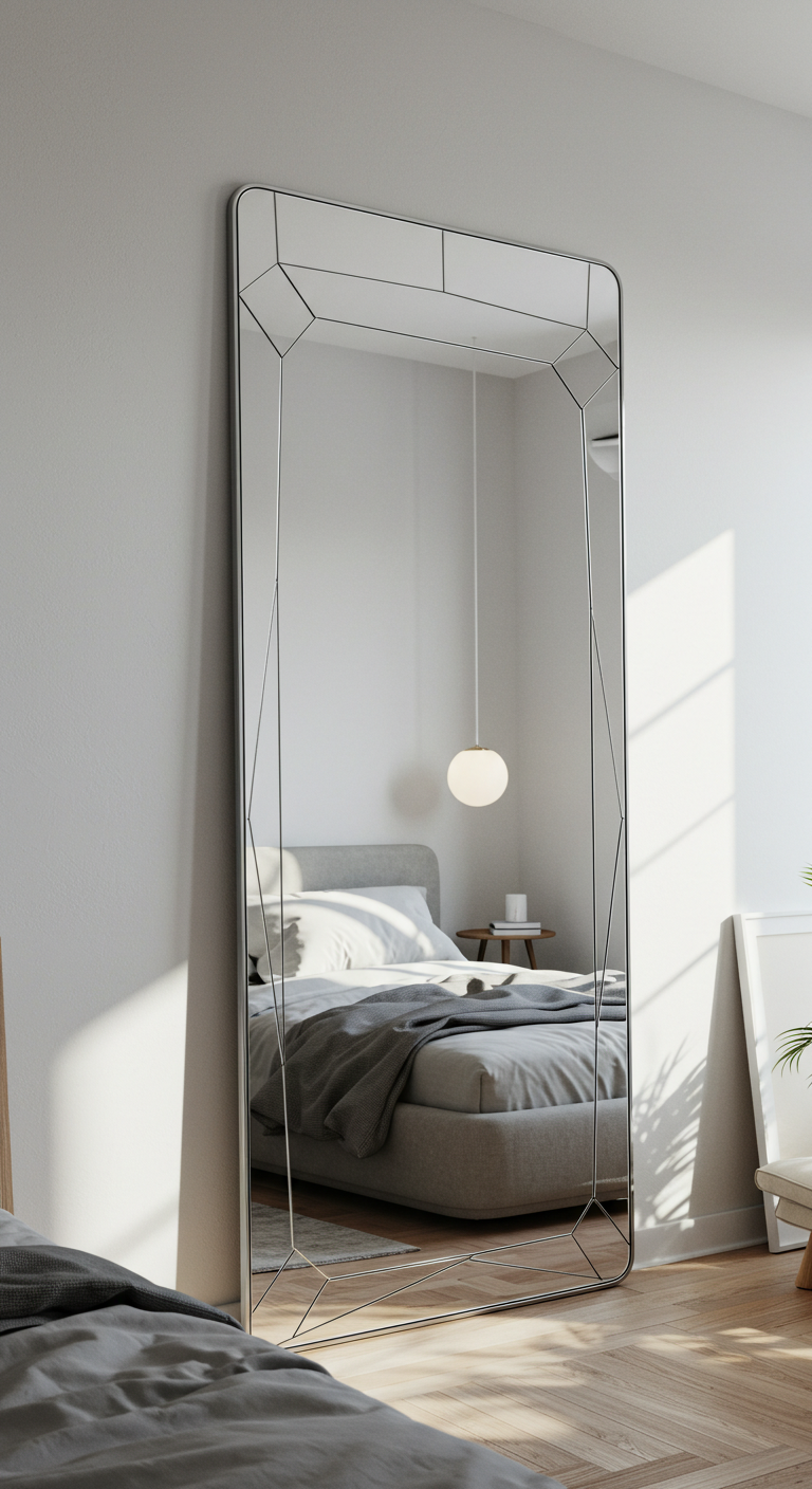 Les miroirs ne se contentent pas de refléter la lumière, ils sculptent littéralement l’espace. Dans une chambre minimaliste, un grand miroir aux formes géométriques simples devient un élément décoratif à part entière. Cercle parfait, rectangle allongé ou forme hexagonale, le miroir structure le mur tout en doublant visuellement la surface de la pièce.