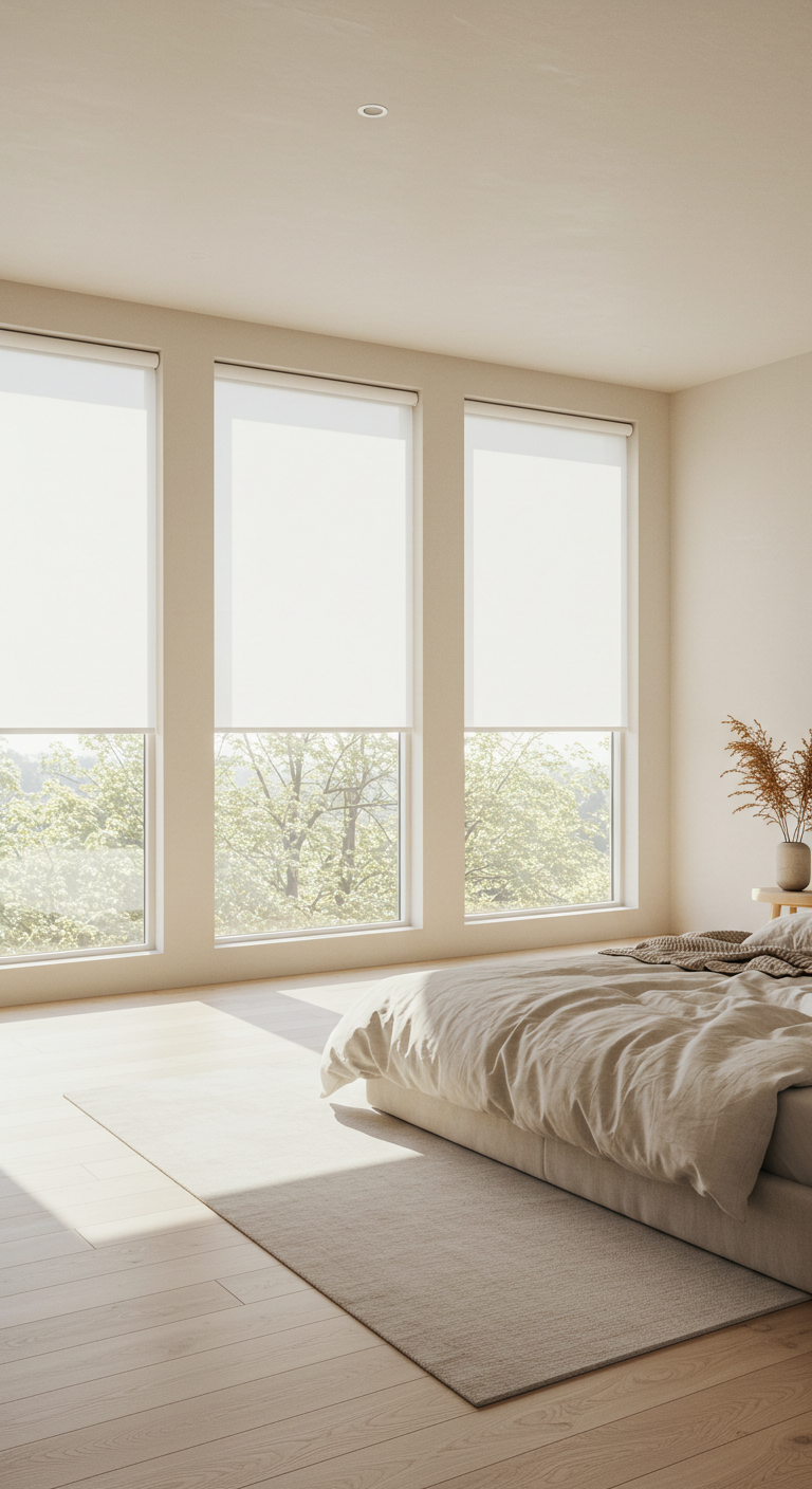 Les fenêtres nues ou habillées de stores ultra-simples maximisent l’entrée de lumière naturelle et simplifient l’esthétique générale. Cette approche radicale convient particulièrement aux environnements urbains ou aux vues dégagées. Si l’intimité l’exige, optez pour des stores enrouleurs blancs ou des films occultants discrets.