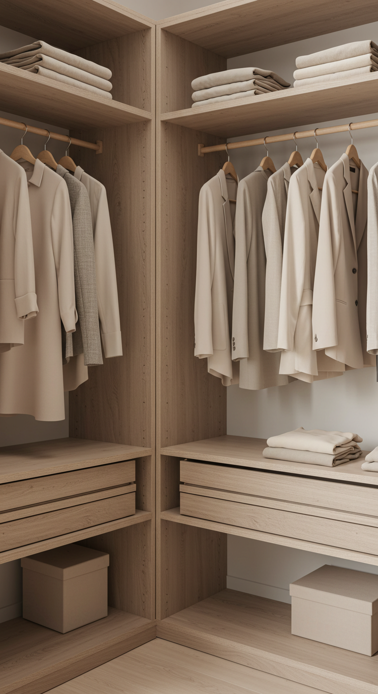 L’organisation doit être impeccable : vêtements triés par couleur, accessoires rangés dans des boîtes uniformes, chaussures alignées. Cette approche encourage naturellement le tri et la sélection qualitative du vestiaire. Le dressing ouvert convient parfaitement à la philosophie minimaliste du “moins mais mieux”.