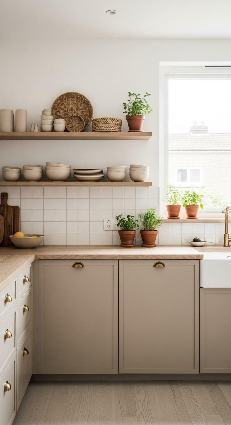 Le dosseret en carreaux métro blancs ou en carreaux de ciment beige apporte de la texture sans rompre l’harmonie chromatique. Sur le rebord de la fenêtre, cultivez des herbes aromatiques dans de petits pots en terre cuite. Cette cuisine devient un espace où il fait bon cuisiner, entouré de matériaux naturels et de couleurs apaisantes qui transforment chaque moment culinaire en méditation active.