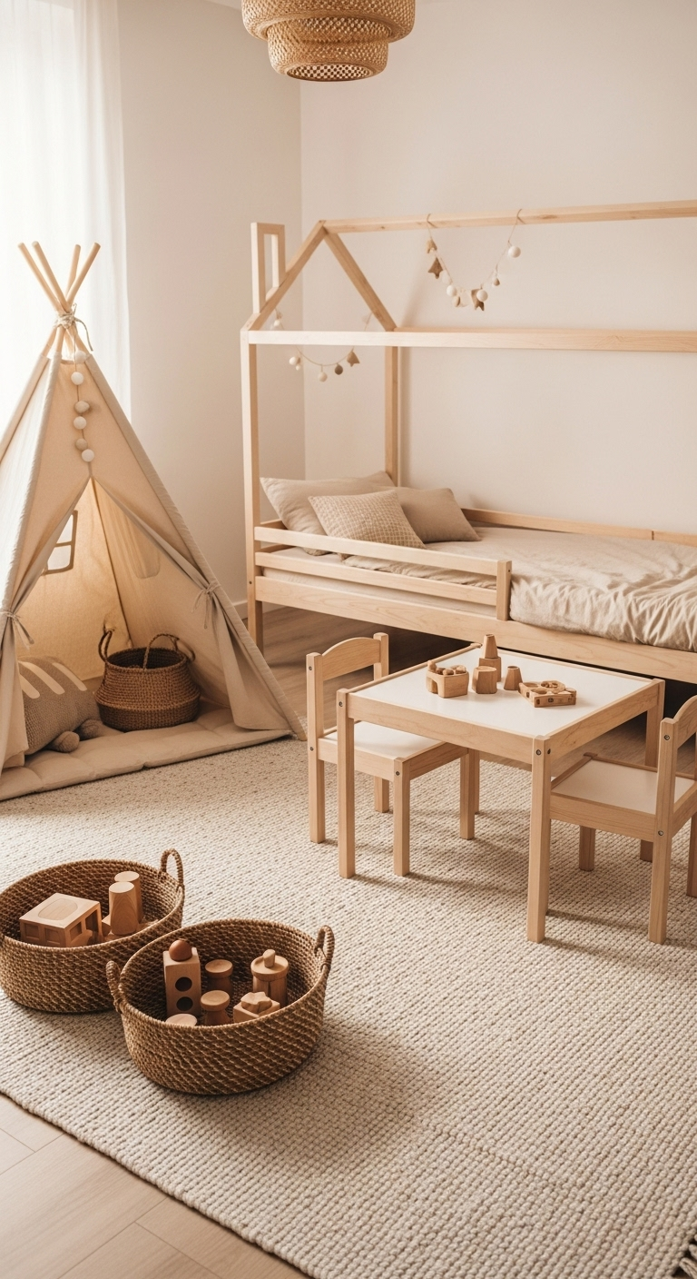 Le mobilier en bois clair comprend une petite étagère basse où les jouets sont rangés dans des paniers en osier ou en coton naturel. L’approche minimaliste encourage la rotation des jouets – seuls quelques-uns sont accessibles à la fois, réduisant le désordre et favorisant le jeu créatif concentré. Un tapis moelleux en laine beige ou crème délimite l’espace de jeu.