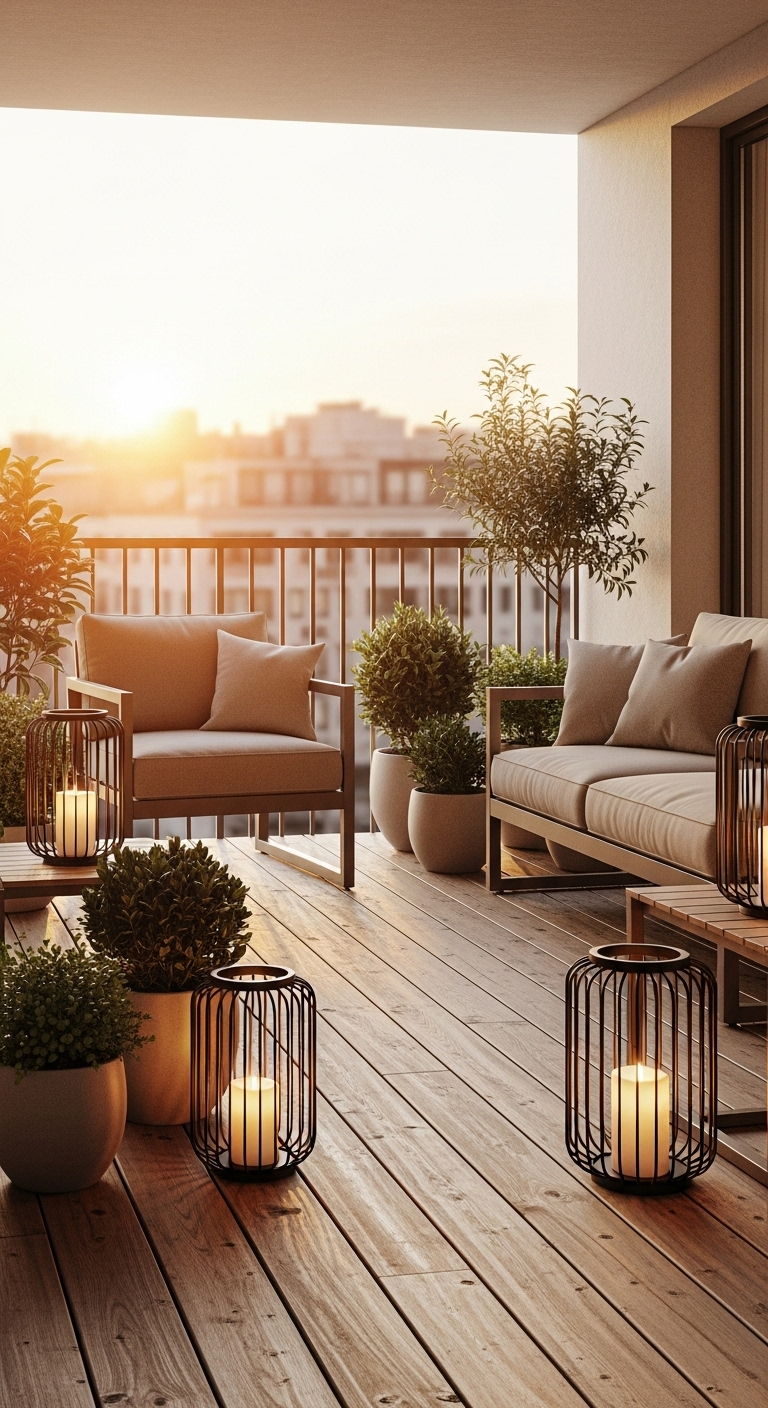 Les plantes sont essentielles : utilisez des pots en terre cuite naturelle, en béton ou en céramique beige pour créer un jardin vertical ou grouper plusieurs pots de différentes tailles. Optez pour des plantes faciles d’entretien comme des graminées ornementales, des succulentes ou des herbes aromatiques. Des lanternes en métal ou en bois avec bougies LED créent une ambiance magique le soir. Un plaid en coton gaufré beige jeté sur une chaise invite à profiter des soirées fraîches. Ce balcon devient votre refuge extérieur pour méditer ou prendre votre café du matin.