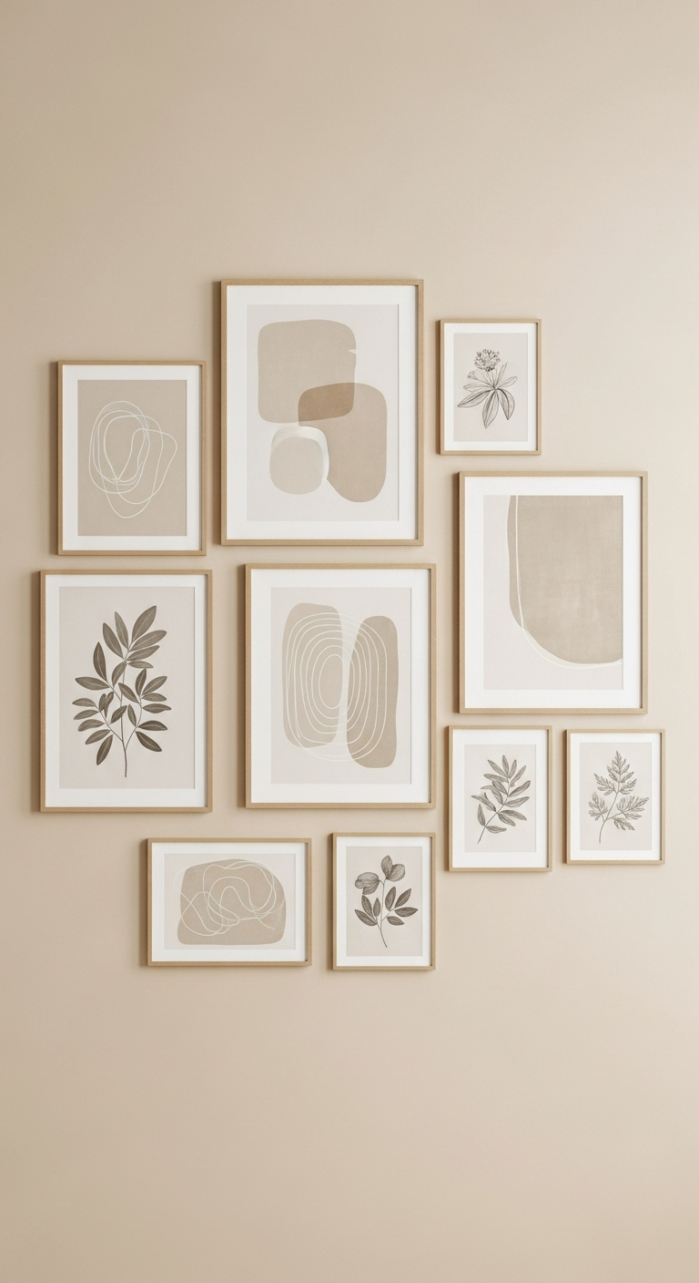 Le contenu des cadres reste dans la palette beige, crème, taupe et blanc cassé. Choisissez des photographies noir et blanc, des aquarelles abstraites aux tons neutres, des illustrations botaniques vintage, ou des impressions de paysages désertiques. Vous pouvez également inclure des œuvres typographiques minimalistes avec des citations inspirantes en police épurée.