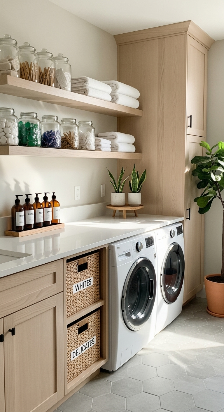 Des bocaux en verre avec étiquettes kraft contiennent lessive écologique, bicarbonate de soude et autres produits naturels. Cette présentation transforme les corvées en rituels esthétiques. Des paniers en osier ou en coton naturel servent au tri du linge par couleur ou par type de tissu, empilés sur des étagères ouvertes.