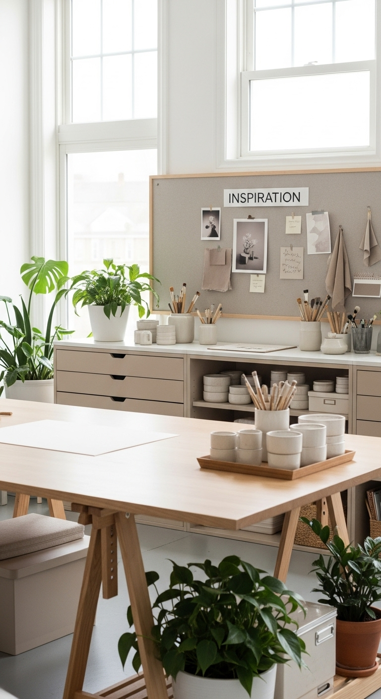 Pour les âmes créatives, concevez un atelier minimaliste beige qui stimule l’imagination tout en maintenant l’ordre. Une grande table de travail en bois massif clair offre amplement d’espace pour vos projets artistiques. Sa surface peut porter les marques de votre créativité, ajoutant caractère et histoire.