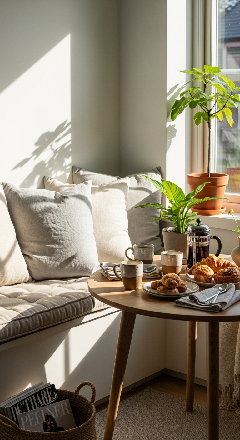 Créez un coin petit-déjeuner minimaliste qui rend chaque matin spécial. Une banquette intégrée en bois clair le long d’une fenêtre maximise l’espace tout en offrant une assise confortable. Des coussins en lin lavé beige et crème, de différentes tailles et textures, créent un nid douillet.