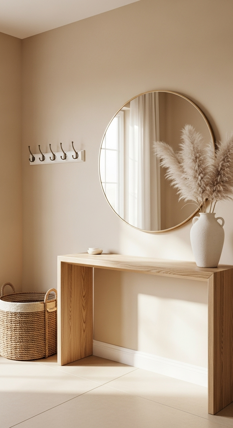La première impression compte ! Créez une entrée minimaliste beige qui accueille vos invités avec élégance. Une console étroite en bois clair le long du mur offre un espace pour déposer clés et courrier sans encombrer le passage. Au-dessus, un miroir rond ou rectangulaire avec cadre en bois naturel reflète la lumière et agrandit visuellement l’espace.