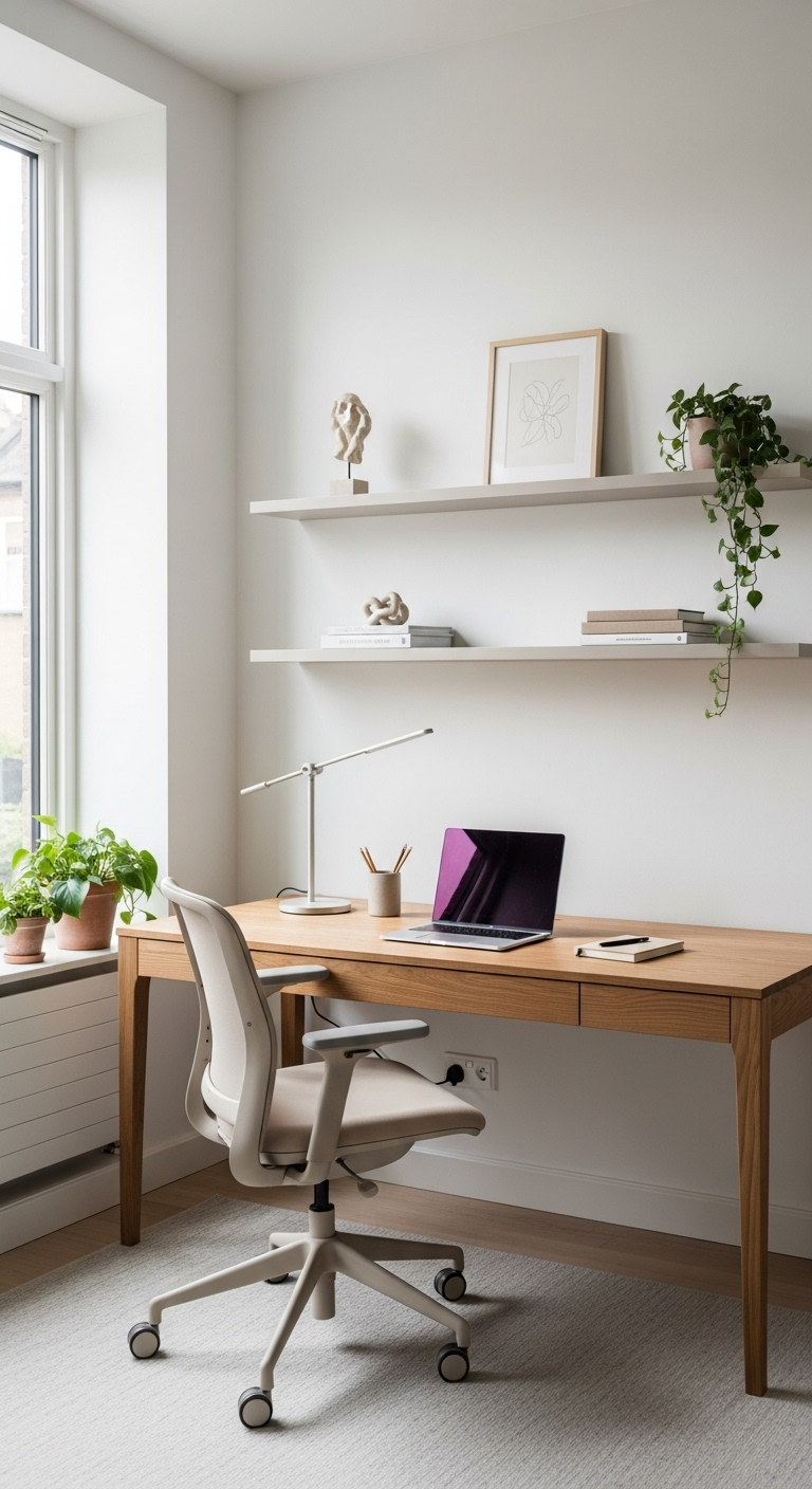 Les murs beige clair servent de toile de fond apaisante pour vos journées de travail. Des étagères flottantes en bois accueillent quelques livres soigneusement sélectionnés, des dossiers dans des chemises en lin naturel et un ou deux objets décoratifs significatifs. L’organisation est clé : utilisez des boîtes en carton recyclé couleur kraft ou des paniers en jonc de mer pour ranger fournitures et documents.