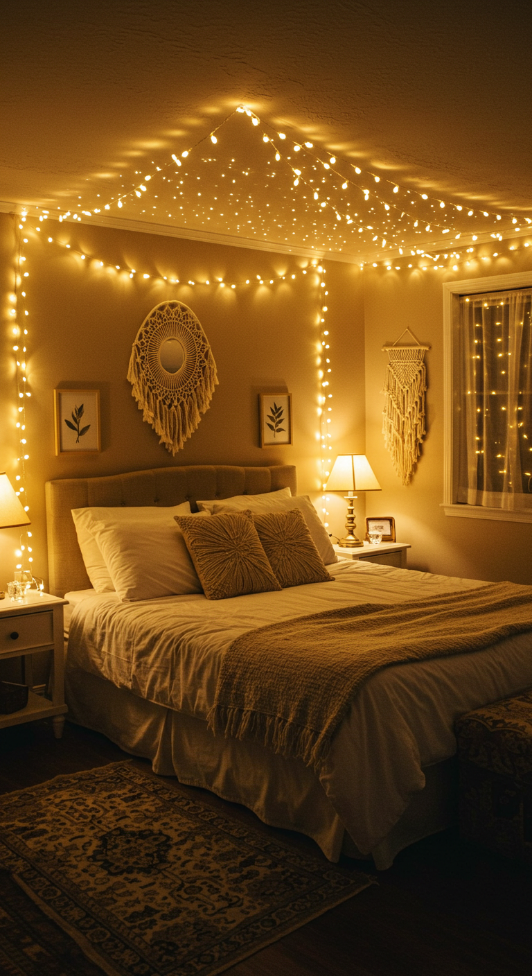 Pour réaliser cette installation impressionnante, fixez des crochets dans les quatre coins de votre pièce (ou plus, selon la taille de l’espace). Ensuite, drapez vos guirlandes lumineuses d’un coin à l’autre, créant des courbes naturelles et élégantes. Vous pouvez créer un motif en étoile depuis le centre du plafond vers chaque coin, ou simplement des lignes parallèles qui traversent la pièce. L’utilisation de plusieurs guirlandes de longueurs différentes ajoute de la profondeur et du dynamisme. Cette technique est particulièrement efficace dans les salons, les chambres spacieuses, ou même les vérandas. Le soir, lorsque vous éteignez les lumières principales, l’effet est absolument magique et crée une ambiance festive et chaleureuse, parfaite pour les soirées entre amis ou les moments de détente en famille.