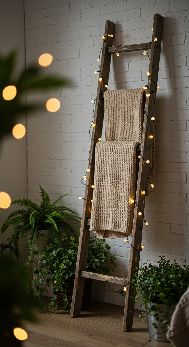 Donnez une seconde vie à une vieille échelle en bois en la transformant en élément décoratif lumineux. Cette idée apporte une touche rustique et chaleureuse à votre intérieur tout en créant un point d’intérêt visuel unique.